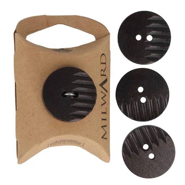 De ronde knopen van Milward hebben groeven op één helft en kunnen met de hand worden aangezet door de twee gaatjes.